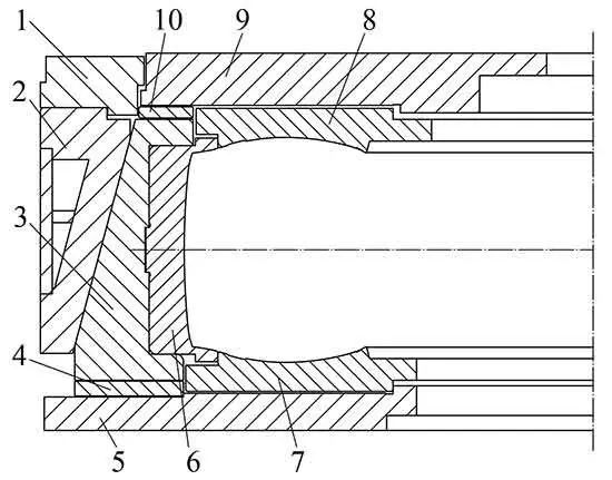 工業輪胎模具導向機構的導向面為圓錐面的稱為圓錐面式活絡模具,與斜平面相比,圓錐面有良好的可加工性,普通的機床可滿足精度要求。圓錐面式模具的裝配精度要求較低,模具零件磨損后,周向偏差能夠自動補償,對硫化輪胎圓度影響小,對輪胎的膠邊和錯花問題影響也不明顯。但是模具開合過程中,弓形座和中模套上的耐磨板由線接觸逐漸過渡到圓錐面接觸,造成耐磨板不均勻磨損、模具動作不平穩以及對硫化機的適應性低。